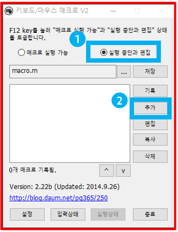 3. 먼저 "실행 중단과 편집" 버튼을 누른 뒤, 그다음 "추가" 버튼을 눌러서 매크로를 기록합니다.
