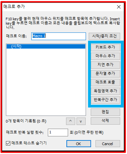 4. 매크로로 기록할 수 있는 방법은 키보드 버튼, 마우스 버튼, 지연, 문자열 등 다양하게 사용할 수 있습니다.