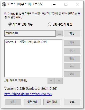 "매크로 실행 가능" 버튼을 클릭한 뒤, F2키를 누르면 매크로가 시작됩니다. 그리고 F3키를 누르면 매크로가 중단되죠.